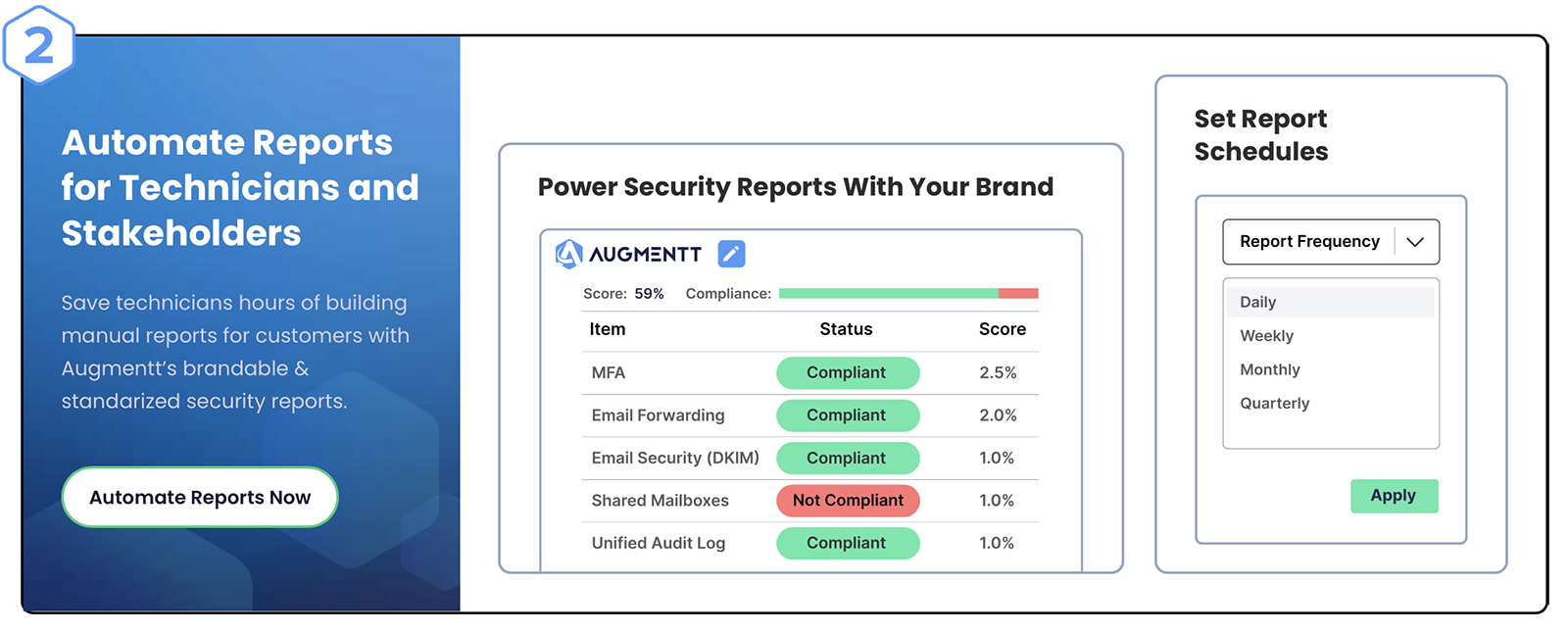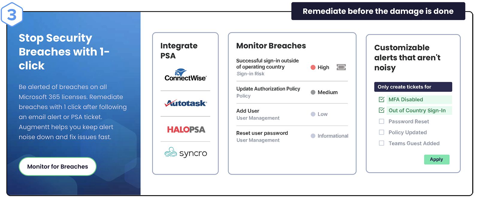 M365 MANAGEMENT & SECURITY Microsoft, verdens mest populære forretningsapplikasjon, er også det mest attraktive målet for hackere. Å beskytte dette miljøet er en oppgave som ofte faller på MSPer. Disse oppgavene er ofte manuelle, og konfigurasjon av sikkerhetsstillinger og retningslinjer innebærer mye repetisjon. Mangel på rapporteringsmuligheter og multi-tenant-funksjonalitet gjør administrasjon av M365-sikkerhet tungvint og utfordrende for MSPer. Augmentt er en tjeneste designet spesielt for MSPs. Den hjelper deg med sentralisering av oppgaver og sikkerhet i Microsoft 365. Augmentt gir MSPs muligheten til å øke sikkerhets- og servicenivået hos kunder, samtidig som løsningen forenkler admin-arbeidet. Bruk mindre tid – få høyere omsetning. Microsoft 365 Security & Management for MSPs 1 SIKKERHETSMAL 2 RAPPORTER 3 SIKKERHETSBRUDD Bruk anbefalte sikkerhetsprosedyrer Få branded rapporter automatisk levert Stopp sikkerhetsbrudd med én klikk 6 STEG TIL MSP-SUKSESS med AUGMENTT Interessert å lære hvordan du kan tjene mer penger og redusere ressursbruk ved bruk av Augmentt? Tilby en "Premium Microsoft-sikkerhetspakke" med Augmentt sikkerhetsfunksjoner og få tilbake 10x mer enn du betaler for Augmentt. Videoen viser steg som kan brukes for å øke salg - og sikkerhet hos kunder. HVORFOR AUGMENTT AUTOPILOT Håndter og konfigurer alle M365-kunder fra ett konsoll Konfigurer, overvåk, beskytt og oppdag mistenkelig aktivitet i M365 Enkel konfigurering av kunders sikkerhetsregler Automatisk varsling ved enhver endring av sikkerhetsregler Sanntidsvarsler ved kritiske sikkerhetsbrudd Auto Remediation - automatisk sperre mistenkelige pålogginger og brukerhandlinger i Microsoft 365 - på natten i helger, osv. Conditional Access Policy Manager - importer, dupliser og konfigurer Conditional Access Policyer på tvers av kunder/tenants i Augmentt 100-Point Audit - få statusrapport om 100 sikkerhetskonfigurasjoner i Microsoft Augmentt MFA - en enkel og rimelig løsning - designet spesielt for MSPer for administrasjon og overvåking av MFA på tvers av alle M365-kunder/p> FORDELER Varsler om trusler Motta varsler om trusler via e-post i sanntid. For å unngå unødvendige varsler kan du endre alvorlighets-graden for varsler. Dersom en M365-sikkerhetstrussel oppdages, kan du raskt løse problemet direkte fra Augmentt-plattformen. Sikkerhetsanalyse og oppsett Få anbefalinger om sikkerhets- og samsvarsinnstillinger som skal være på plass. Kartlegg sikkerhetstilstand hos hver enkelt kunde, og løs problemer direkte fra Augmentt-konsollet. Overvåking av tilstand Etter at de riktige sikkerhetsinnstillingene har blitt konfigurert er det enkelt å overvåke endringer i Microsoft 365 innstillinger. Spar tid ved å se hele 365-bildet via ett konsoll. Innebygde rutiner Unngå sikkerhets- eller konfigurasjonsfeil når du skal opprette, eller fjerne en bruker. Oppgaver blir enklere og sikrere når du kan følge oppdaterte « Best Practice Workflows » som ligger i systemet. Øk effektiviteten Frigjør verdifull tid ved å utføre oppgaver for alle kunder i Augmentt-portalen: Opprette / fjerne brukere Aktivere MFA Tilbakestille passord på brukere Flytte brukere mellom grupper Gjøre om fjernet bruker til en delt e-post Endre lisenstype m.m. ×Lukk Augmentt SECURE ×Lukk Augmentt DISCOVER ×Lukk Augmentt ENGAGE